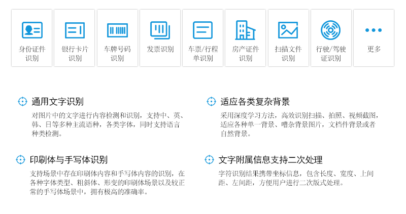 光學(xué)字符識別(OCR)利用深度學(xué)習(xí)方法,在CNN和RNN的基礎(chǔ)上,研發(fā)改進圖片文字識別的算法體系,并將之應(yīng)用于發(fā)票、行程單、的士票、收據(jù)等各類票據(jù),各類身份證件,各類銀行卡片識別場景,為領(lǐng)域業(yè)務(wù)提供智能化服務(wù)。